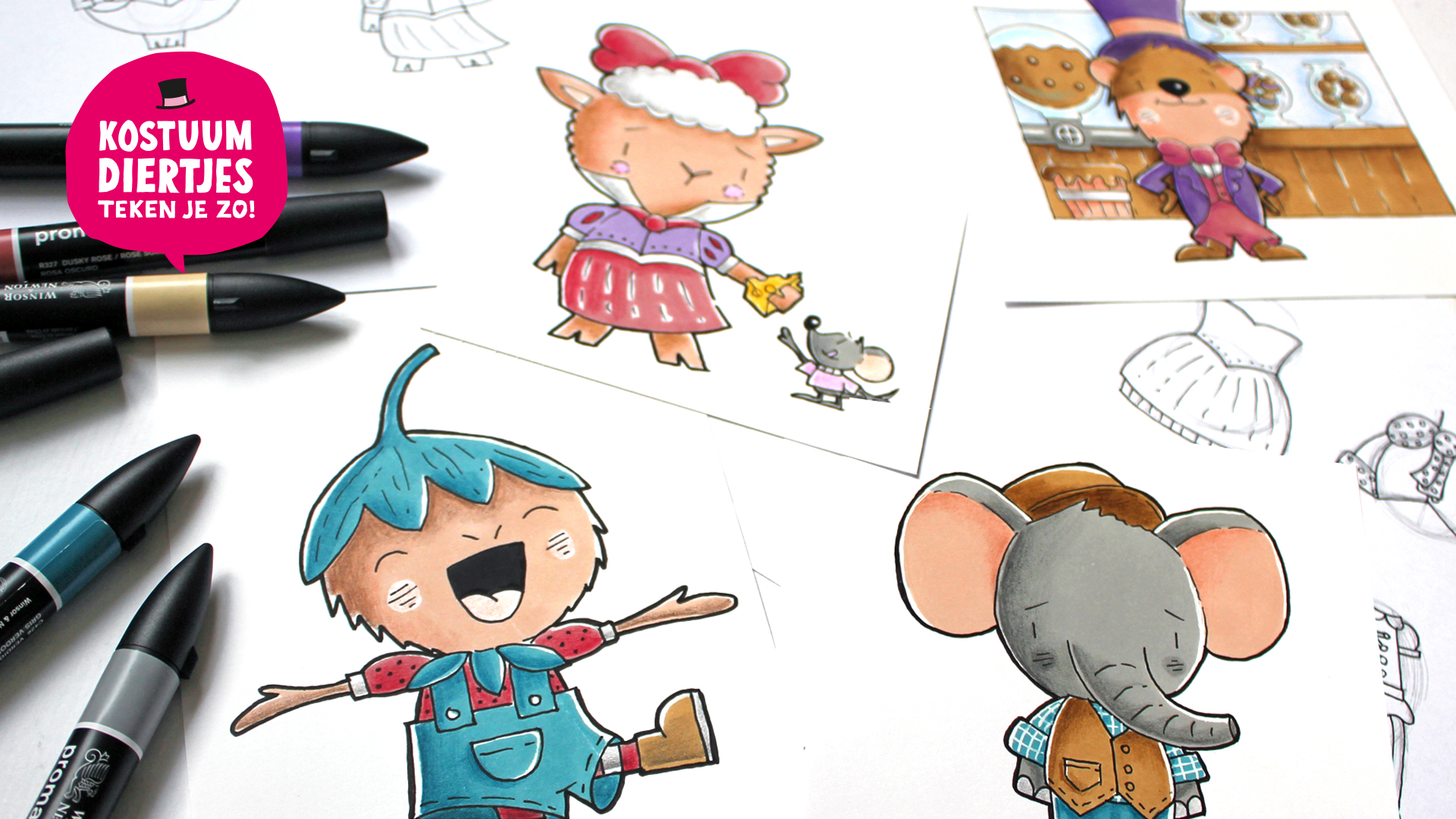 Bij deze cursus kun je het boek ‘Kostuumdiertjes teken je zo! gebruiken voor inspiratie om diertjes te tekenen. In dit boek vind je heel veel stap-voor-stap voorbeelden!